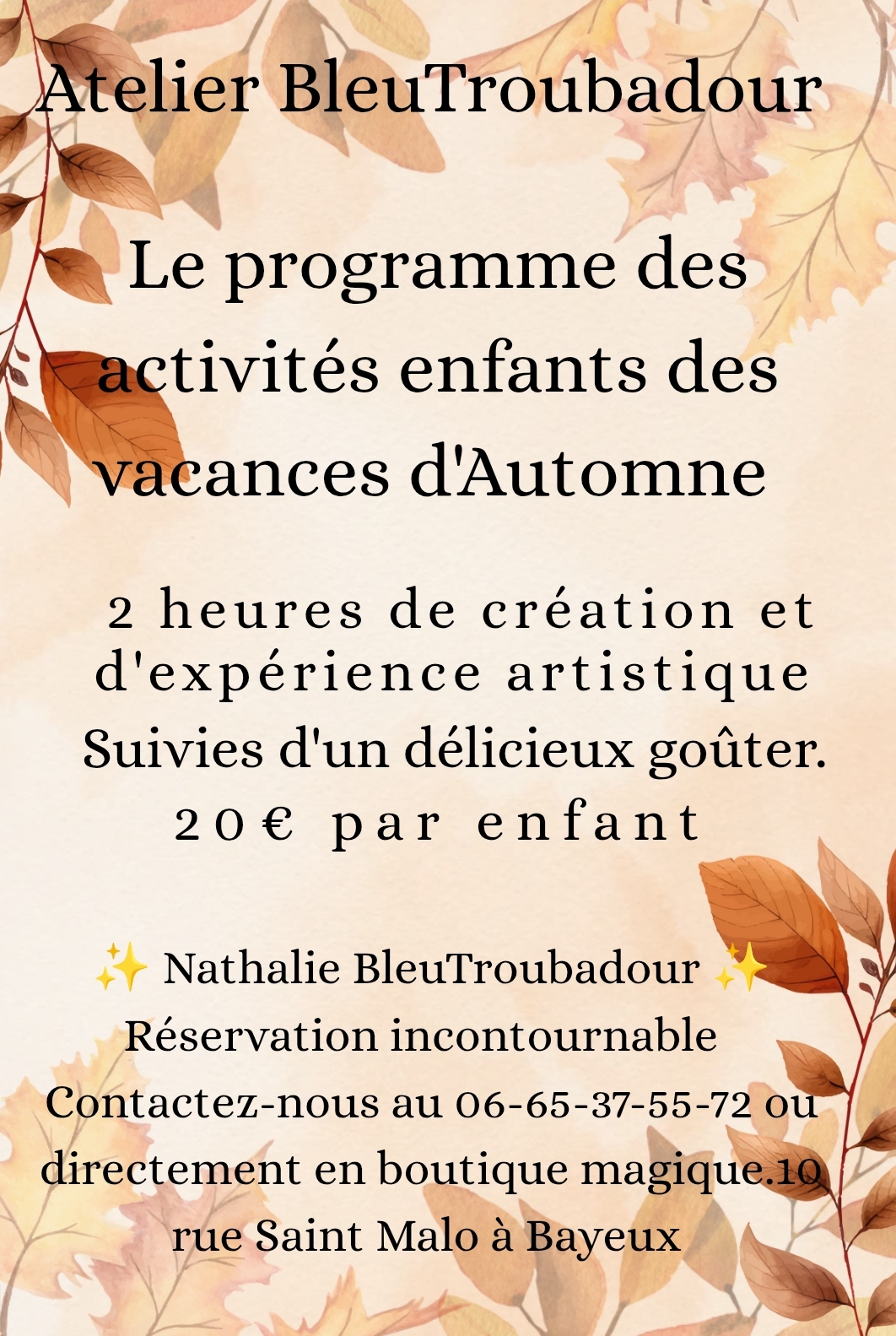 Les enfants sont accueillis par Nathalie BleuTroubadour qui les guide dans la création de façon ludique et joyeuse . Goûter inclus